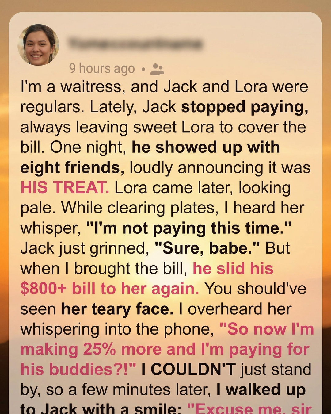 One evening, Jack arrived with a group of friends, announcing loudly that dinner was “on him.” The energy at the table was confident and carefree. When Lora arrived later, her expression told a different story. She looked tired, distracted, as though she had already lived through the night before it truly began. As I cleared plates, I overheard her quietly say she wasn’t paying this time. Jack smiled easily and brushed it off with casual reassurance. But when the check came, he slid it back toward her, just as he had before. The number was high, and her face reflected a mix of shock and resignation that stayed with me long after I walked away.