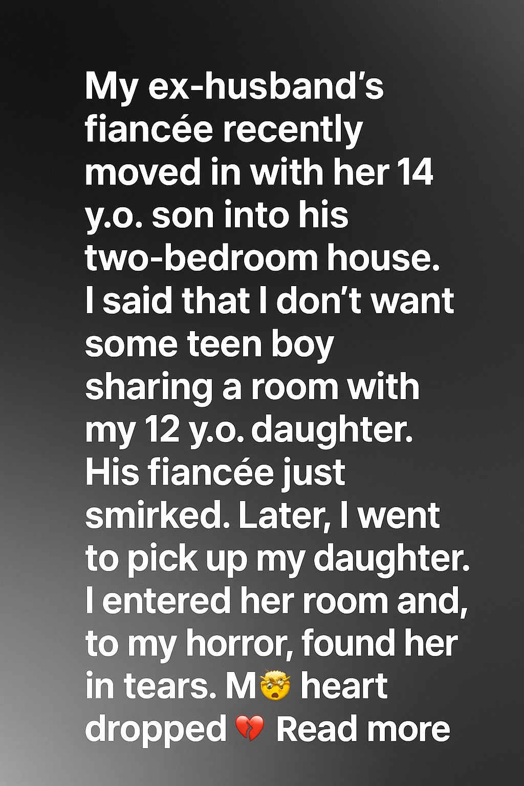 My ex-husband’s fiancée recently moved in with her 14 y.o. son into his two-bedroom house. I said that I don’t want some teen boy sharing a room with my 12 y.o. daughter. His fiancée just smirked. Later, I went to pick up my daughter. I entered her room and, to my horror, found her in tears. My heart dropped. In that moment, all I could think about was how deeply I had hoped the transition between households would be smooth for her. Even though our marriage had ended, I wanted our daughter to feel secure in both homes, surrounded by adults who respected her boundaries and emotional needs. Seeing her curled up on the edge of the bed, fighting back sobs, made it painfully clear that something in that house had changed far more than sleeping arrangements.