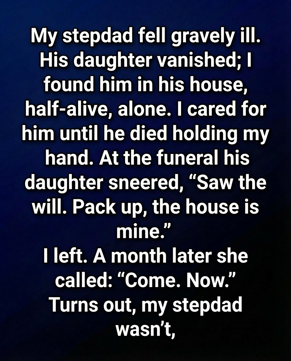 I moved on with my life, believing that chapter was closed. Nearly a month later, my phone rang late at night. Her voice was urgent, stripped of its earlier certainty. She demanded that I come over immediately. Confused but concerned, I returned to the house I had once cared for so diligently. What awaited us there was not drama, but clarity. Documents had surfaced—papers my stepfather had quietly arranged while I was caring for him. They were simple, thoughtful, and intentional, reflecting his wishes without bitterness or revenge.