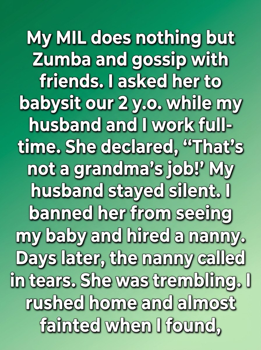 My MIL does nothing but Zumba and gossip with friends. I asked her to babysit our 2 y.o. while my husband and I work full-time. She declared, “That’s not a grandma’s job!” My husband stayed silent. I banned her from seeing my baby and hired a nanny. Days later, the nanny called in tears. She was trembling. I rushed home and almost fainted when I found,